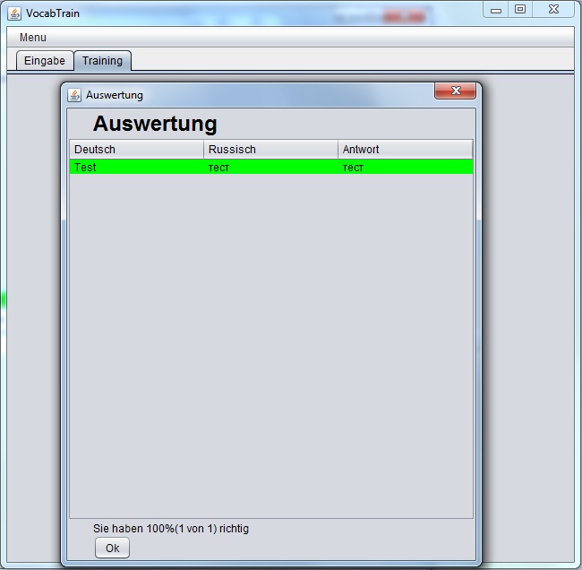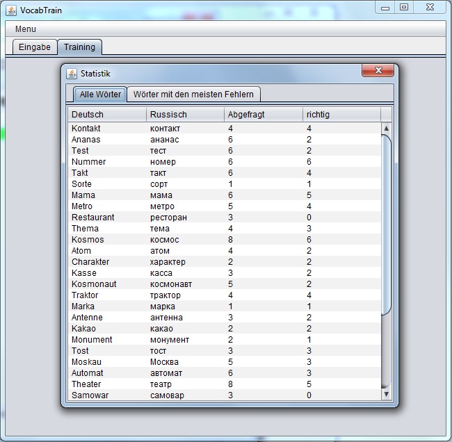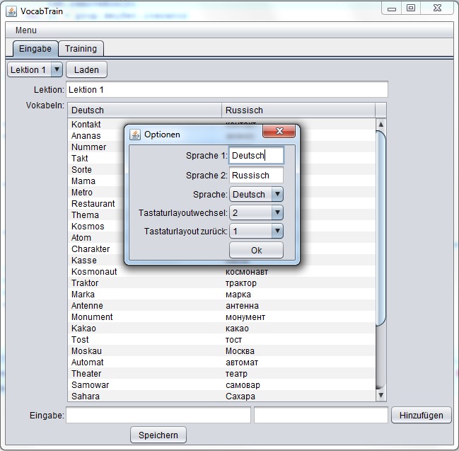 Ein Vokabeltrainer, bei dem Vokabeln lektionsweise selbst eingegeben werden. Anschließend können diese abgefragt werden. Das Programm kann das Tastaturlayout umstellen, was besonders für Sprachen mit einem anderen Alphabet geeignet ist. |